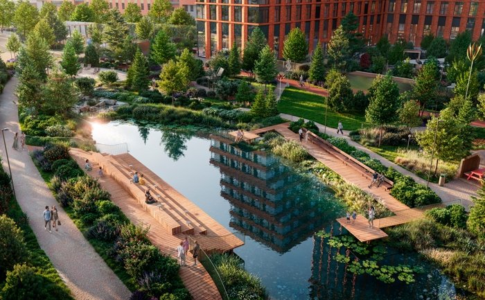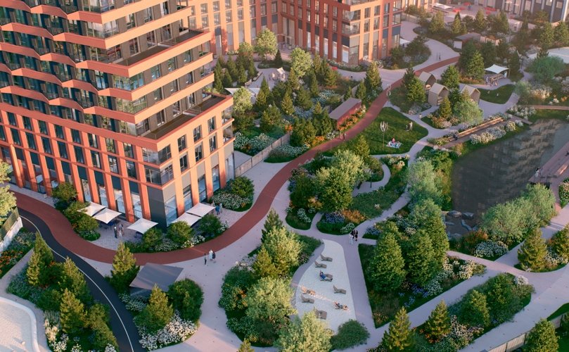 На территории располагается парк площадью около 3 га с прогулочными, беговыми и веломаршрутами в несколько километров, детскими игровыми зонами и спортивными площадками.