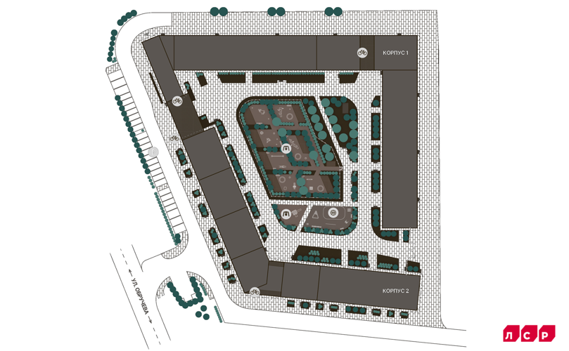 а территории комплекса: закрытый от автомобилей двор со спортивными и детскими площадками, навесами для отдыха и малыми архитектурными формами. Внутри двора для жильцов есть Wi-Fi, скамейки с устройствами для зарядки мобильных телефонов. В обоих корпусах работает новейшая система видеонаблюдения. Для доступа в здания имеются IP-домофоны со встроенным модулем Wi-Fi и возможностью подключения индивидуальной вызывной панели. Также предусмотрено парковочное пространство с зоной, оборудованной для подкачки колес и пространство для одновременной зарядки электромобилей