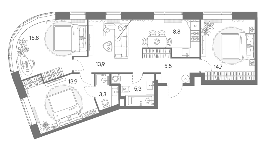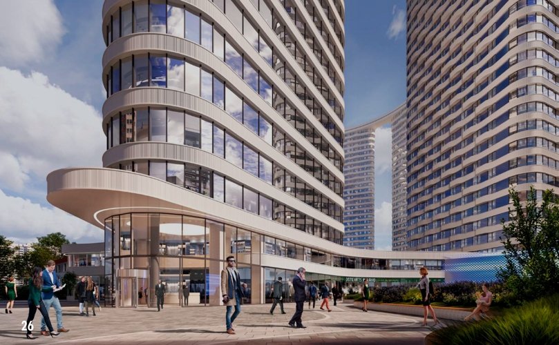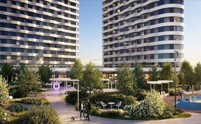 В этом комплексе есть закрытый зеленый двор без машин, в котором оборудованы лаунж-зоны, детские и спортивные площадки. Центральным элементом двора является сухой фонтан с вечерней подсветкой. Жители могут воспользоваться услугами wellness-центра и spa. В стилобате комплекса находится гастрономическая улица, коворкинги, мультимедийный развлекательный центр и детский сад. Для удобства жильцов предусмотрен подземный паркинг с кладовыми для хранения вещей