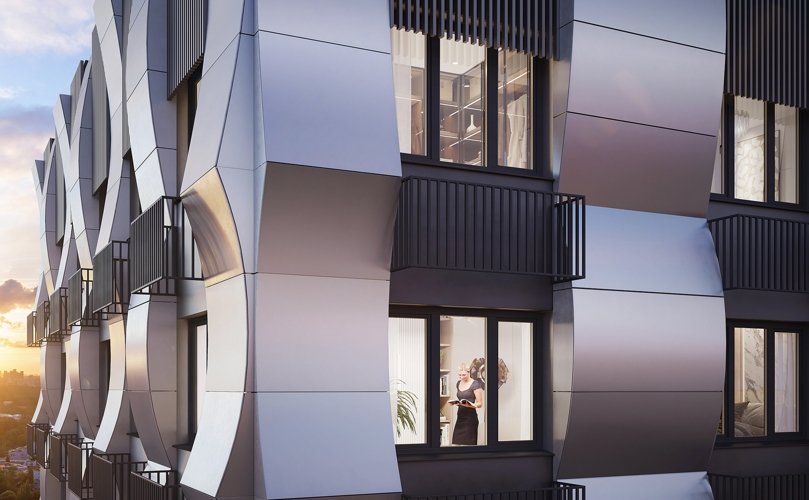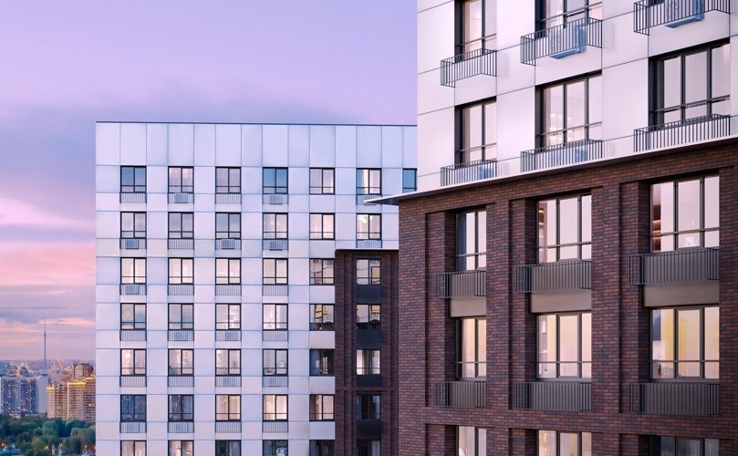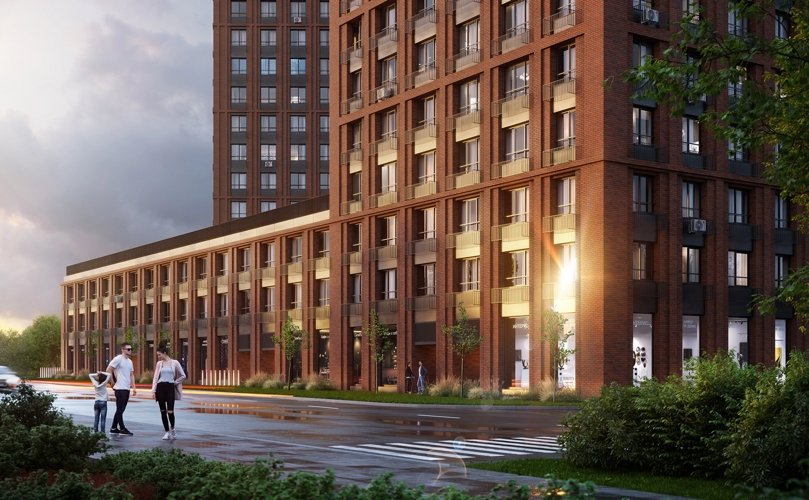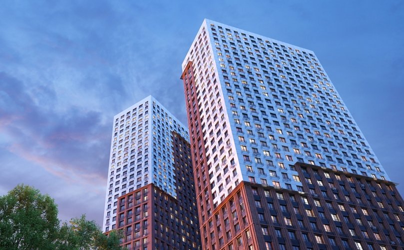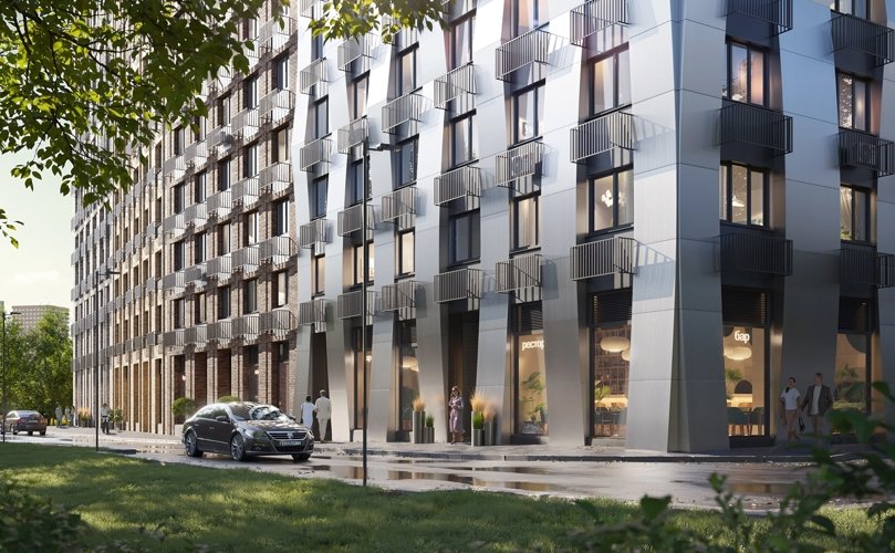 Здания объединены трехэтажным стилобатом, в котором размещаются коммерческие помещения.